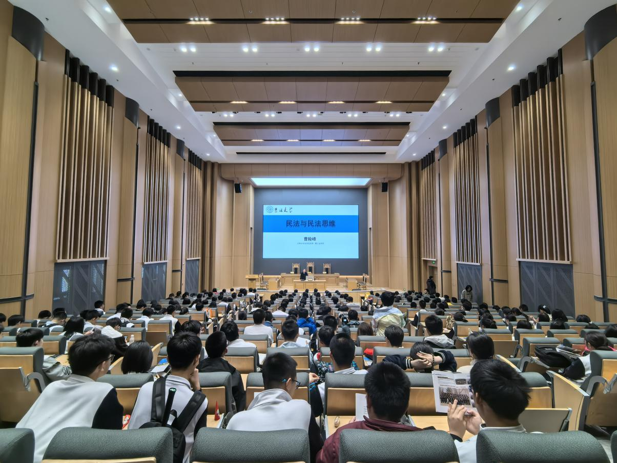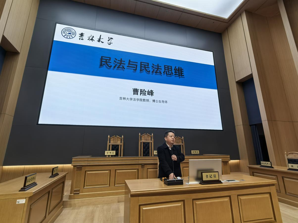 4月18日十时许,吉大附中的二百余名学生在吉林大学法学楼门前集合,在学生志愿者和带队老师的带领下参观了B101模拟法庭报告厅。在庄重宏伟的模拟法庭中,由曹险峰教授为同学们讲授了一堂以“民法与民法思维”为主题的讲座。曹教授以生动案例解析热点法律问题,深入浅出的讲解让晦涩的理论变得鲜活,尤其是流浪猫纠纷案的讲解让同学们重新审视责任、道德和法律的边界,逐渐理解法律判断并非非黑即白,法律不仅是冰冷的条文,更是守护社会秩序的规则基石。同学们对于高度还原法庭真实场景的教室倍感新奇,身临其境式的学习体验更加激发了同学们对成人在线