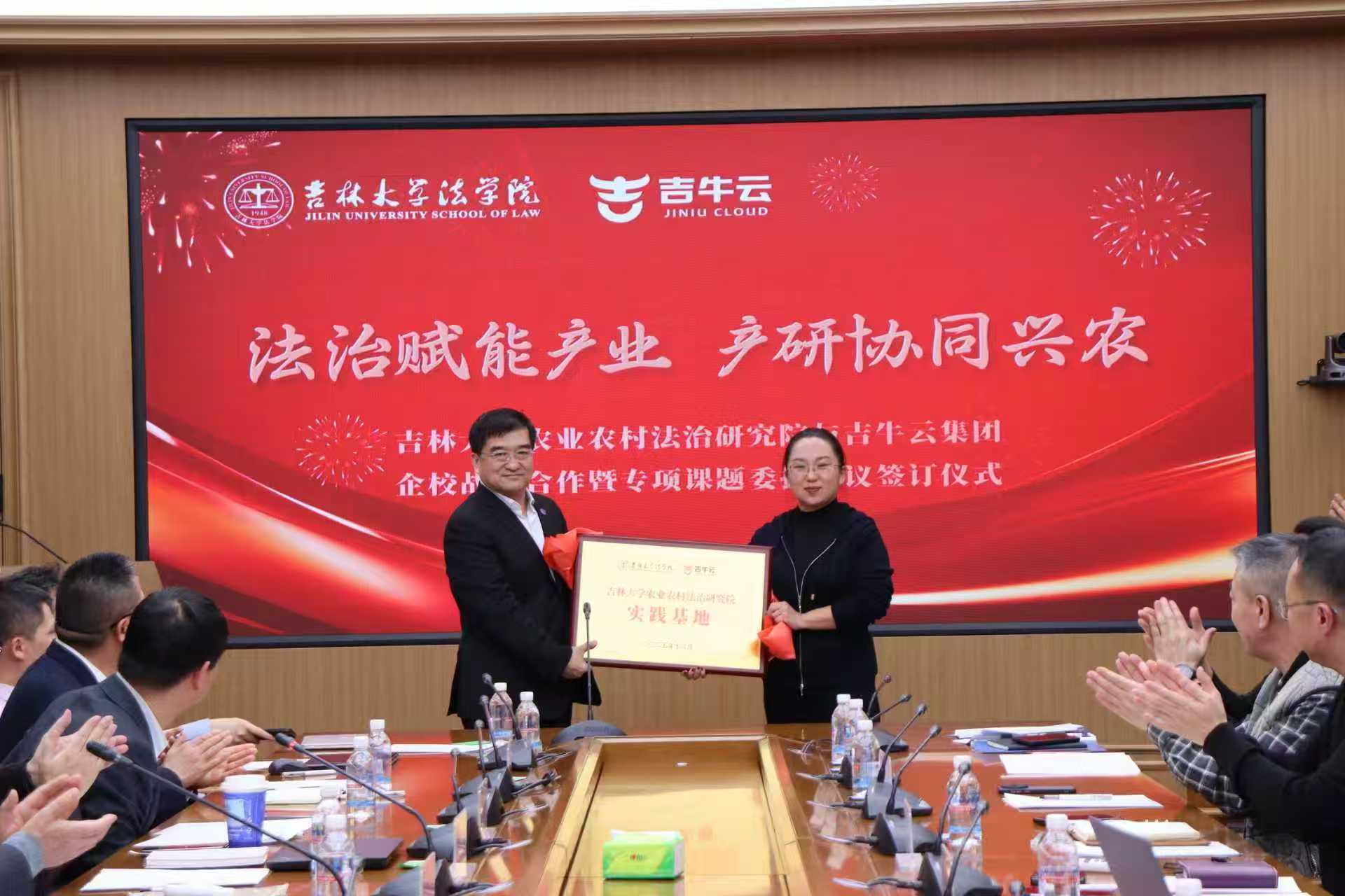 签约仪式后,何志鹏院长代表吉林大学农业农村法治研究院,向吉牛云集团授予“吉林大学农业农村法治研究院实践基地”牌匾,吉牛云集团董事长李健佳接牌并合影。这一举措标志着双方将共建产研协同平台,为高校人才实践与企业创新发展搭建双向通道。