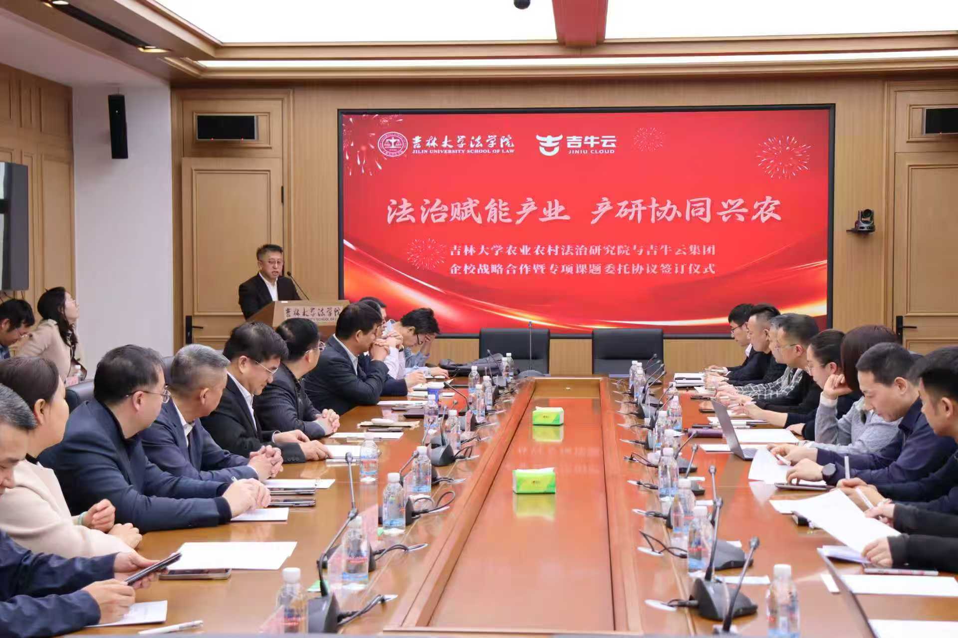12 月 23 日,恰逢农历冬至后初四、“十五五规划” 开局前夕,一场瑞雪为吉林大学增添了别样景致。当日,吉林大学农业农村法治研究院与吉牛云集团企校战略合作暨专项课题委托协议签约仪式在吉林大学校园隆重举行。此次活动以 “法治赋能产业 产研协同兴农” 为核心,标志着高校学术资源与企业创新实践的深度对接,为农业农村产业高质量发展注入新动能。