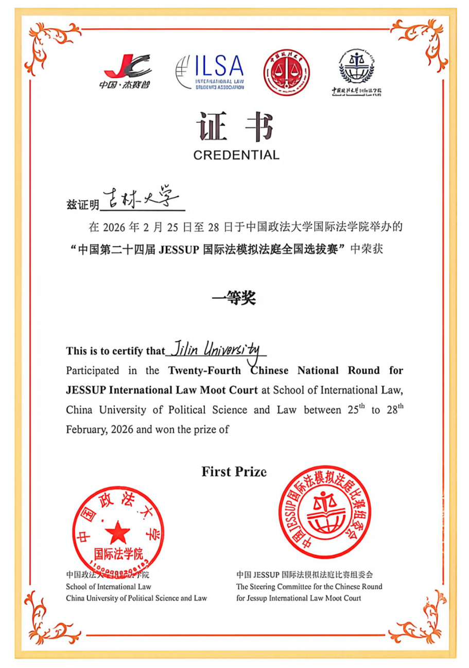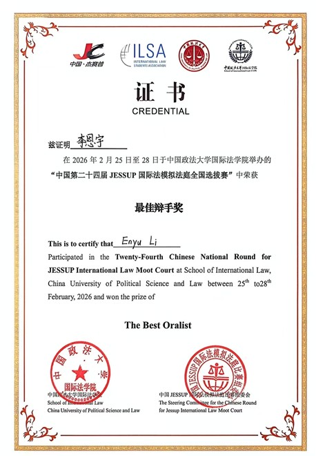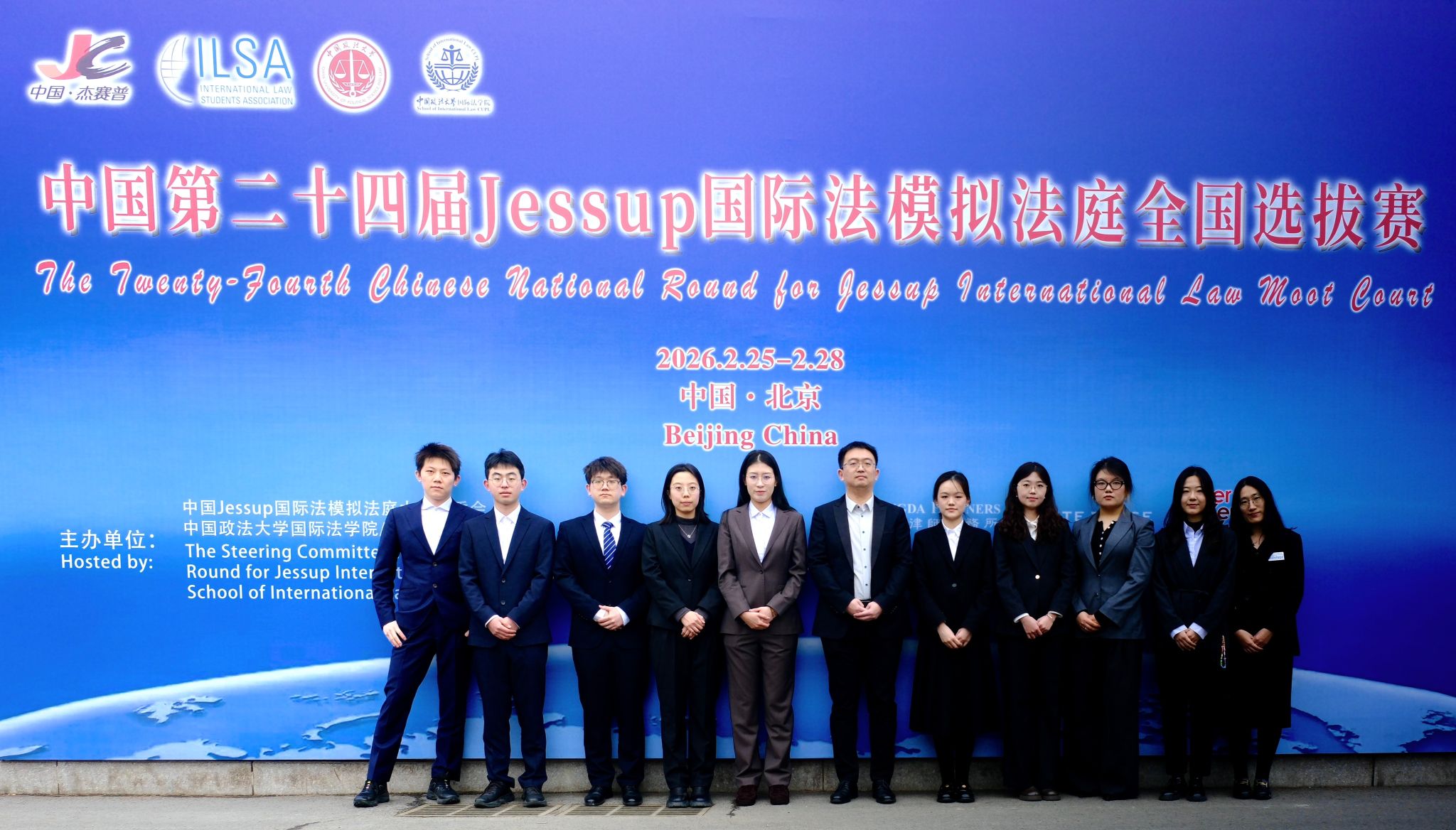 2026年2月24日至28日,第二十四届“杰赛普(JESSUP)国际法模拟法庭竞赛”中国赛区选拔赛在中国政法大学举行。我院代表队以循环赛四战全胜的优异成绩成功突入淘汰赛,最终荣获中国赛区全国一等奖,并成功晋级将于3月28日至4月4日在美国华盛顿特区举行的国际赛。同时,2022级本科生李恩宇获最佳辩手。这刷新了我院代表队在本项赛事中的历史最佳成绩,是我院在涉外法治及国际法教学领域的又一项标志性成果。