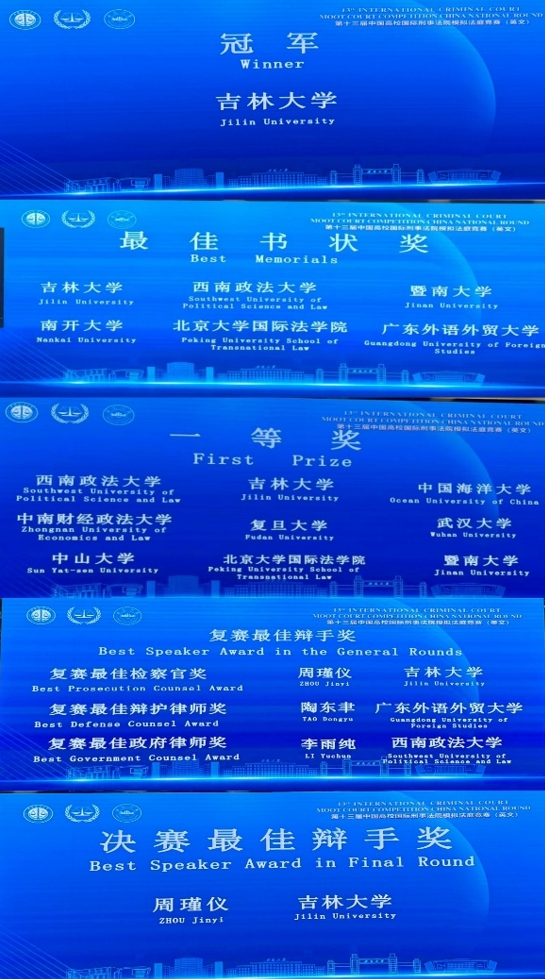 我院代表队凭借扎实的专业功底,在书状遴选阶段成功突围,以书状总分第一名的优异成绩晋级线下庭辩阶段。在为期两天的庭辩中,我院代表队沉着应战,势如破竹,历经五场激烈角逐成功挺进决赛,最终荣获赛事全国冠军、一等奖、最佳书状奖第一名,晋级海牙国际赛,刷新了我院在该赛事中的历史成绩,首次实现书状与庭辩双项第一。同时,我院本科生周瑾仪表现突出,包揽了复赛最佳检察官奖和决赛最佳辩手奖。