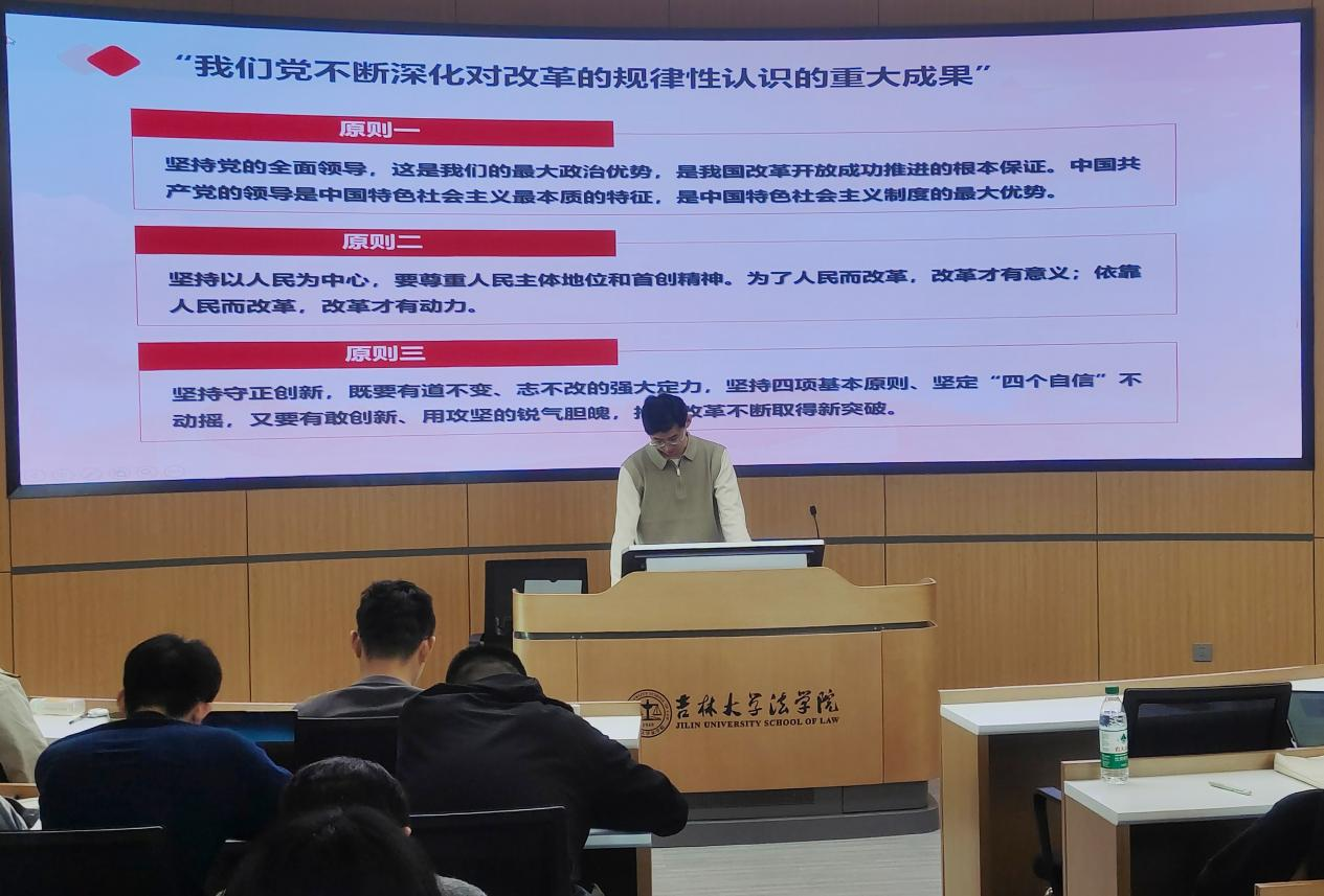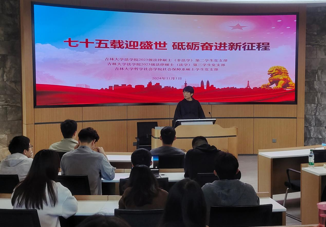 2023级法律硕士(非法学)第二学生党支部、2023级法律硕士(法学)第三学生党支部与哲学社会学院社会保障系硕士学生党支部联合开展主题党日活动。带领研究生党员深入学习新中国成立75周年来的各项事业取得的成就,推动“四史”学习教育深入开展,学习党的二十届三中全会精神,进一步增强研究生党员的理想信念,引导研究生党员从历史征程中汲取前进力量,在学习生活中奋楫扬帆,破浪笃行。本次活动由2023级法律硕士(法学)第三学生党支部书记武浩松同志主持。