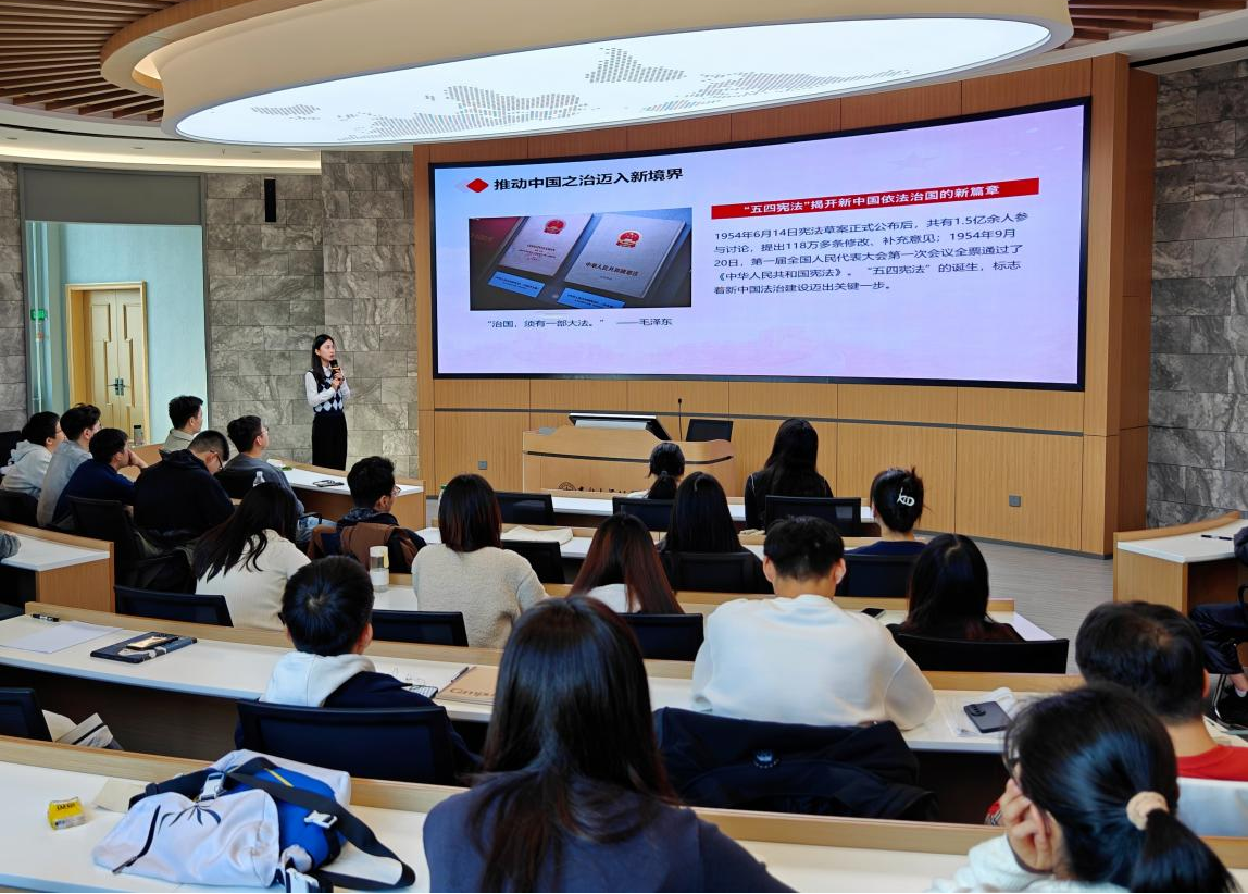 回望奋斗历程 汲取奋进力量。全体参会人员共同观看新中国成立75周年纪录片。随后,2023级法律硕士(法学)第三学生党支部书记武浩松针对新中国成立75周年党的建设成就宣讲专题党课,引导研究生党员和积极分子深入学习党的发展历程,汲取“四史”营养。各党支部成员分享自身学习的心得体会,在交流互鉴中坚定理想信念,激发学习热情。