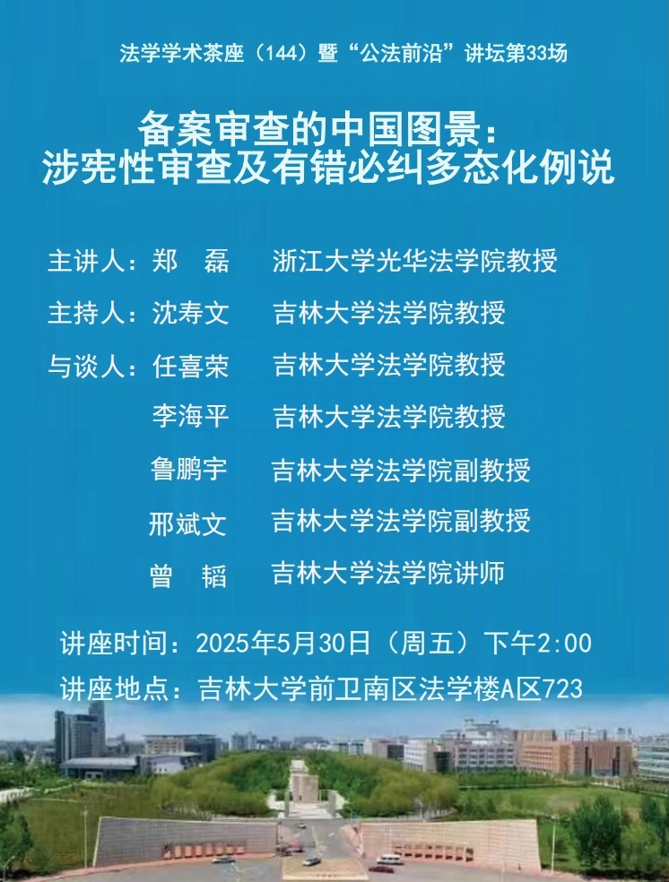 上一篇:中国社会科学院法学研究所赵磊教授做客我院法学学术茶座 下一篇:吉大法学学术茶座(143)暨“公法前沿”讲坛第32场:构建以合宪性审查为核心的宪法监督制度体系与理论体系