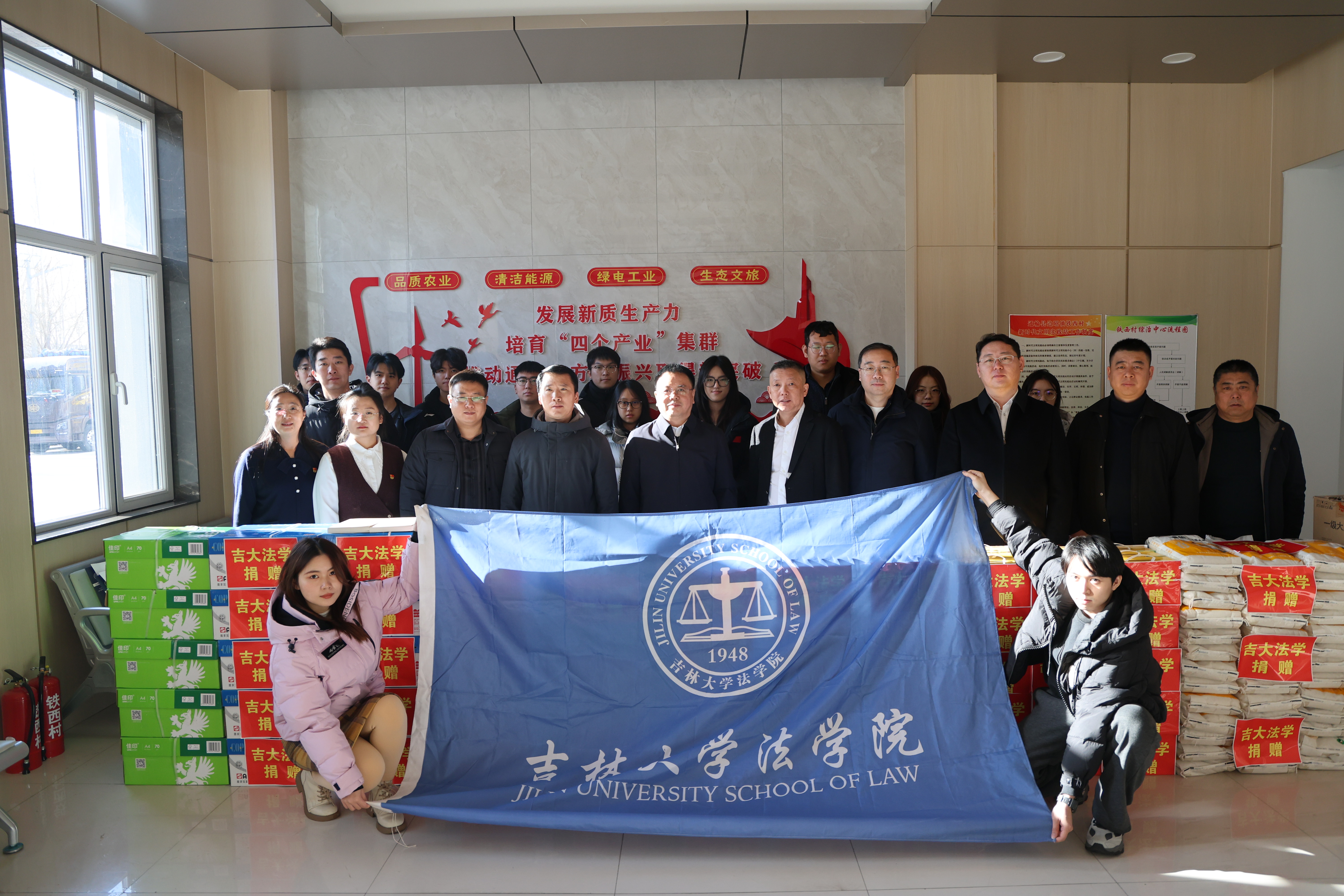 向铁西村捐赠物资,铁西村则回赠锦旗,体现了深厚的校地情谊。随后,张俊峰副书记为村民讲授专题党课,强化党建引领。由学生自编自演的“普法小剧场”生动演绎了赡养纠纷案例,实现了“以案释法”的良好效果。师生们还参观了村办制衣厂,并入户慰问老乡,传递关怀。
