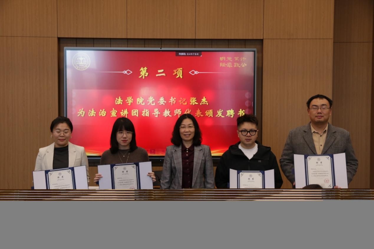 党委书记张杰、吉林大学团委副书记曲侠潼参加学习并为宣讲团青年指导教师代表颁发聘书,为宣讲团成员代表颁发宣讲纪念证书,勉励宣讲团要自觉做习近平法治思想的坚定信仰者、积极传播者、模范实践者,推动法治精神在青年中内化于心、外化于行。